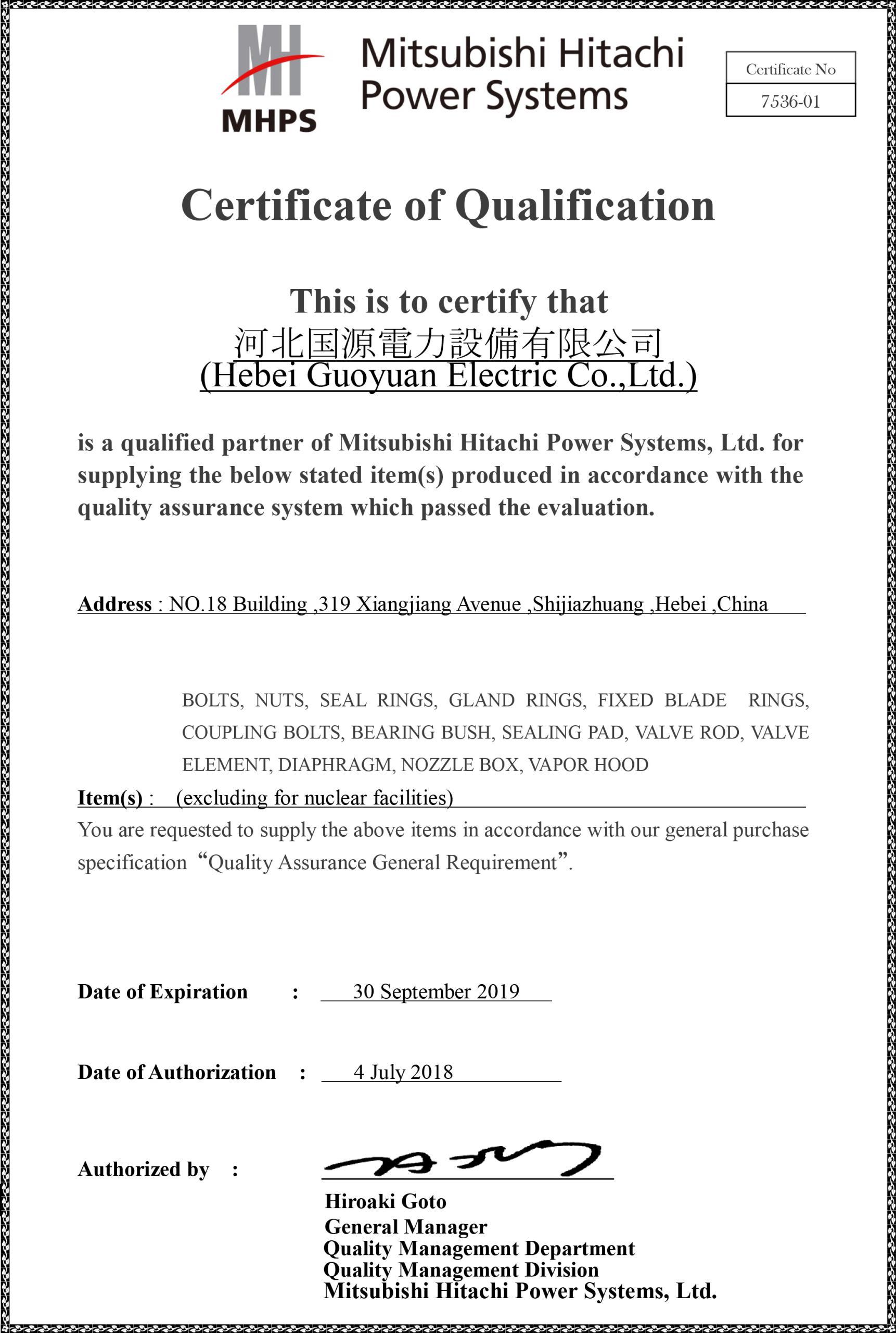 三菱日立電力系統合格供方證書