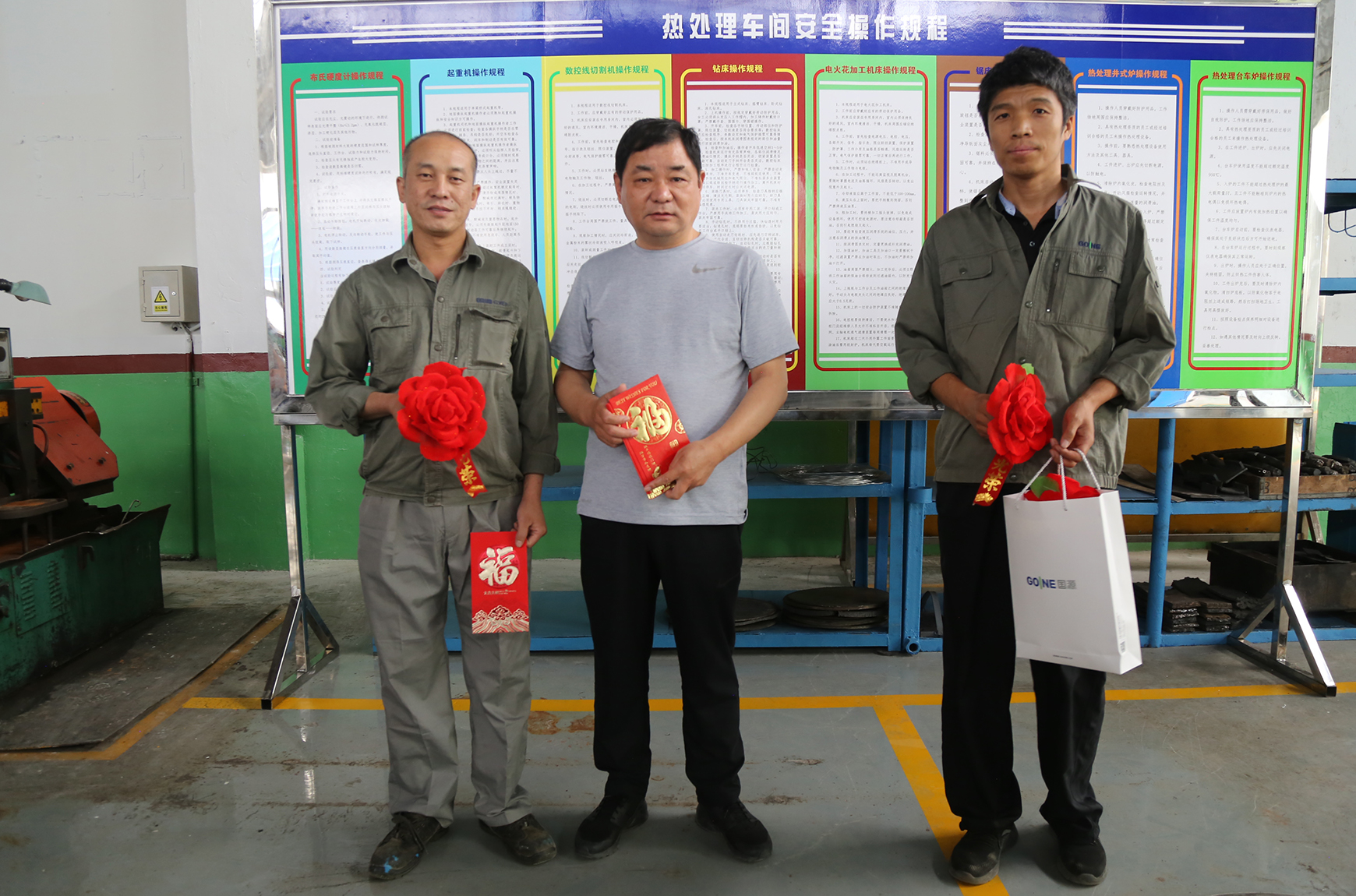 董事長劉運智先生為熱處理車間榮獲首創(chuàng)生產(chǎn)現(xiàn)場“標桿車間”稱號、機加車間北區(qū)榮獲首創(chuàng)生產(chǎn)現(xiàn)場“達標區(qū)域”榮譽稱號,頒發(fā)了榮譽牌匾;生產(chǎn)運營中心副總經(jīng)理趙紹璞同志陪同董事長為現(xiàn)場標桿員工發(fā)放獎金、并佩戴光榮花。