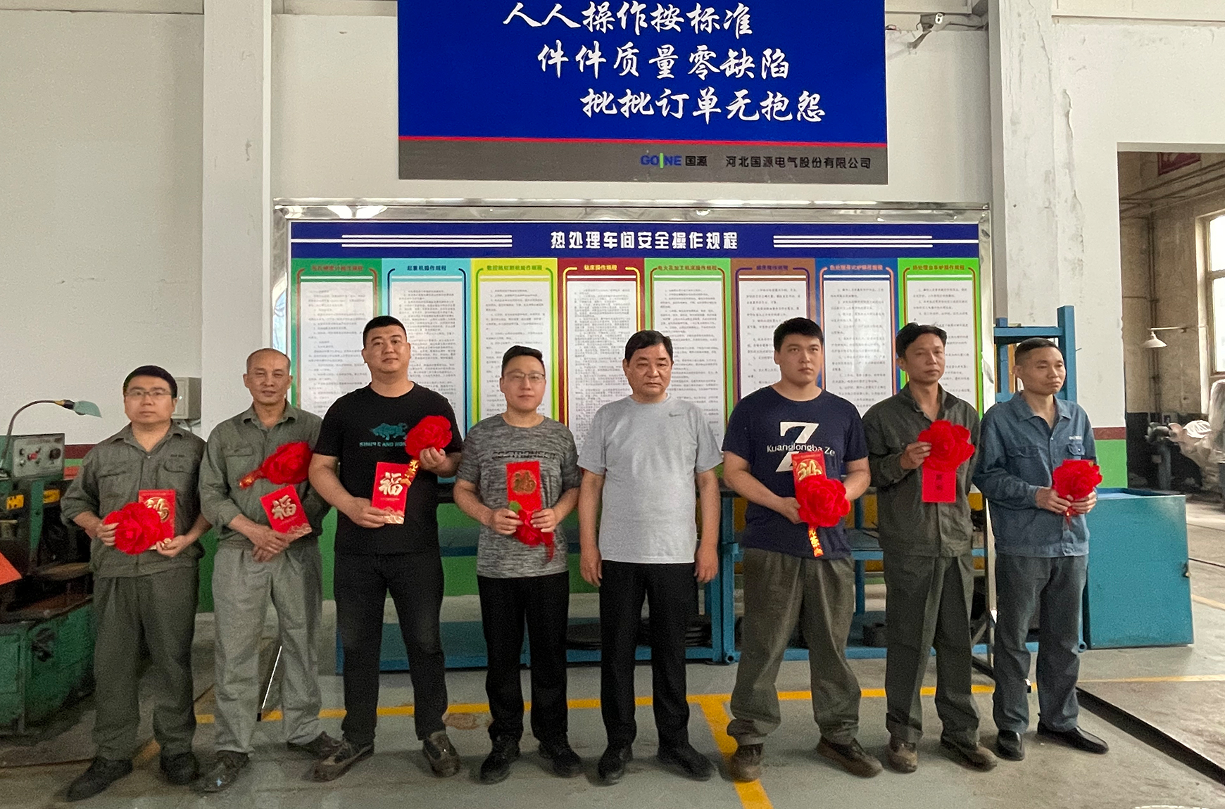 董事長劉運智先生與生產(chǎn)標桿現(xiàn)場第一戰(zhàn)役“4人小組”在“國源文化一條街”合影。劉董要求全公司各級管理干部和全體員工,要向受到表彰獎勵的各類現(xiàn)場標兵和標桿車間學習。更希望受到表彰獎勵的各類標兵和標桿車間要珍惜公司給予的榮譽、給予的認可、給予的尊重、給予的獎勵,要戒驕戒躁、再接再厲、再創(chuàng)高標準、高精益、高質(zhì)量、高精度、高看點的品牌現(xiàn)場,為奪取六月份標桿現(xiàn)場榮譽的多連冠、標兵的多連冠、獎金的多連冠而加油、加力、加快拼搏實干吧!